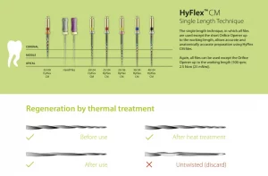 Features- Made of regenerative Titanium Nickel. Pre-sterilised. Much more resistant to cyclic fatigue than conventional NiTi. Low incidence of file fracture. By following the anatomy of the canal, they reduce the risk of steps, displacements or perforations. Extremely flexible and break resistant Long life expectancy due to the integrated controlled shape memory that allows it to regain its shape after heat treatment in the autoclave. Description- HyFlexâ„¢…
