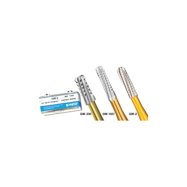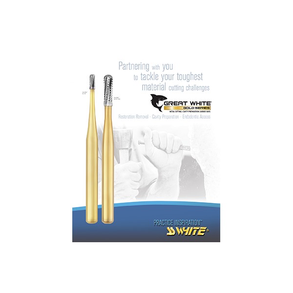 Great WhiteTM Gold Series burs have a unique state of the art design. By increasing dentates and incorporat- ing an enhanced blade geometry, the Gold Series bur cuts faster than a standard dentated (crosscut) bur and smoother than a straight bladed bur.