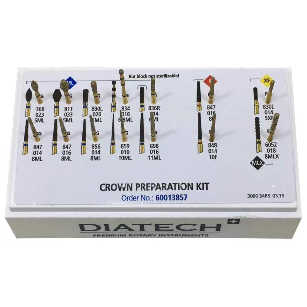 Coltene Crown Preparation Kit, a meticulously curated collection of 14 Multilayered Gold Plated Diamond Burs. Crafted to precision, these burs are indispensable for crown and bridge preparations, ensuring optimal results in various dental restorative applications. Designed for versatility, the Coltene Diatech Crown Preparation Kit excels in shaping hard tooth substances, composites, metals, ceramics, and similar materials. Its comprehensive selection facilitates swift, precise, and efficient tooth preparation, crucial for achieving impeccable marginal fit and restoration longevity. Engineered for convenience, this kit is autoclavable up to 134°C, ensuring sterilization for repeated use. With different shank types and color bands for easy identification, it streamlines your workflow, enhancing efficiency and accuracy in dental procedures. Trust Coltene’s reputation for quality and innovation to elevate your dental practice to new heights. Experience the difference with the Coltene Crown Preparation Kit, your ultimate companion for superior crown and bridge preparations.
