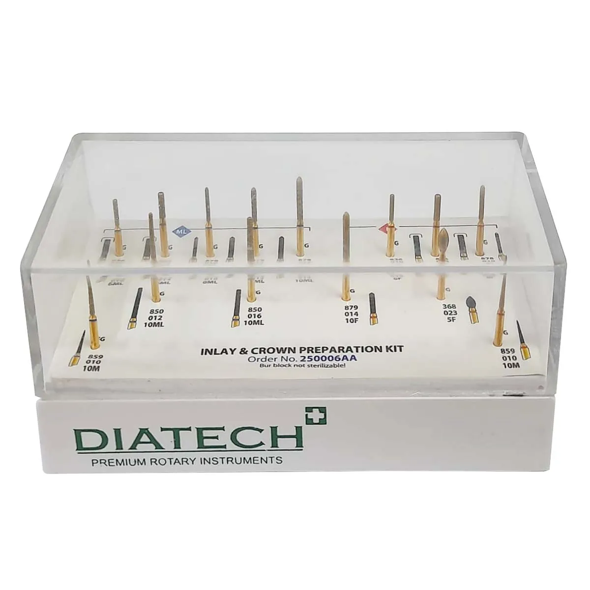 The Coltene Diatech Inlay & Crown Preparation Kit (250006AA) is a meticulously designed dental bur kit engineered for swift, uncomplicated, and precise tooth preparation necessary for a wide array of crown and bridge restorations, veneers, and Onlays. This kit is meticulously crafted to ensure an exceptional marginal fit, a crucial factor in the long-term success and durability of dental restorations. The kit comprises 14 multilayered gold-plated diamond burs, thoughtfully curated for their effectiveness in crown and bridge preparation procedures. These burs feature a friction grip shank configuration and are constructed with a stainless steel shank coated with diamond particles. Additionally, they are autoclavable at temperatures of up to 134°C, guaranteeing sterility and safety in dental practice. The Coltene Diatech Inlay & Crown Preparation Kit comes in premium packaging, reflecting its commitment to quality and precision in dental procedures.