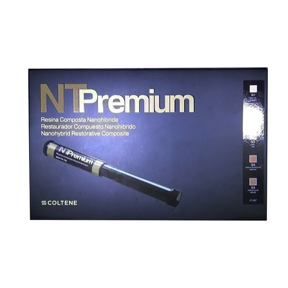 NT Premium is a universal nanohybrid restorative material (average particle size 14 – 40 nm), light-cured, radiopaque, for use in anterior and posterior teeth restoration, both permanent and deciduous. NT Premium sets directly in the cavity or in working models, under the effect  of halogen or LED curing lights. Its concept prioritizes the aesthetic restoration using full chroma body shades that can be combined with a universal opaque and incisal shades (translucent) for higher aesthetic results. The selection and balance of filler sizes combined in the product substantially favors the structural and mechanical properties of the material, allowing ease of handling and polishing, high initial gloss and superior restorations, from aesthetic, mechanical and biological standpoints. The nanofillers are responsible for the handling, sculptability and opalescence of the material. Special pigments confer its fluorescence, one of the few existing composites to mimic the natural fluorescence of real teeth.