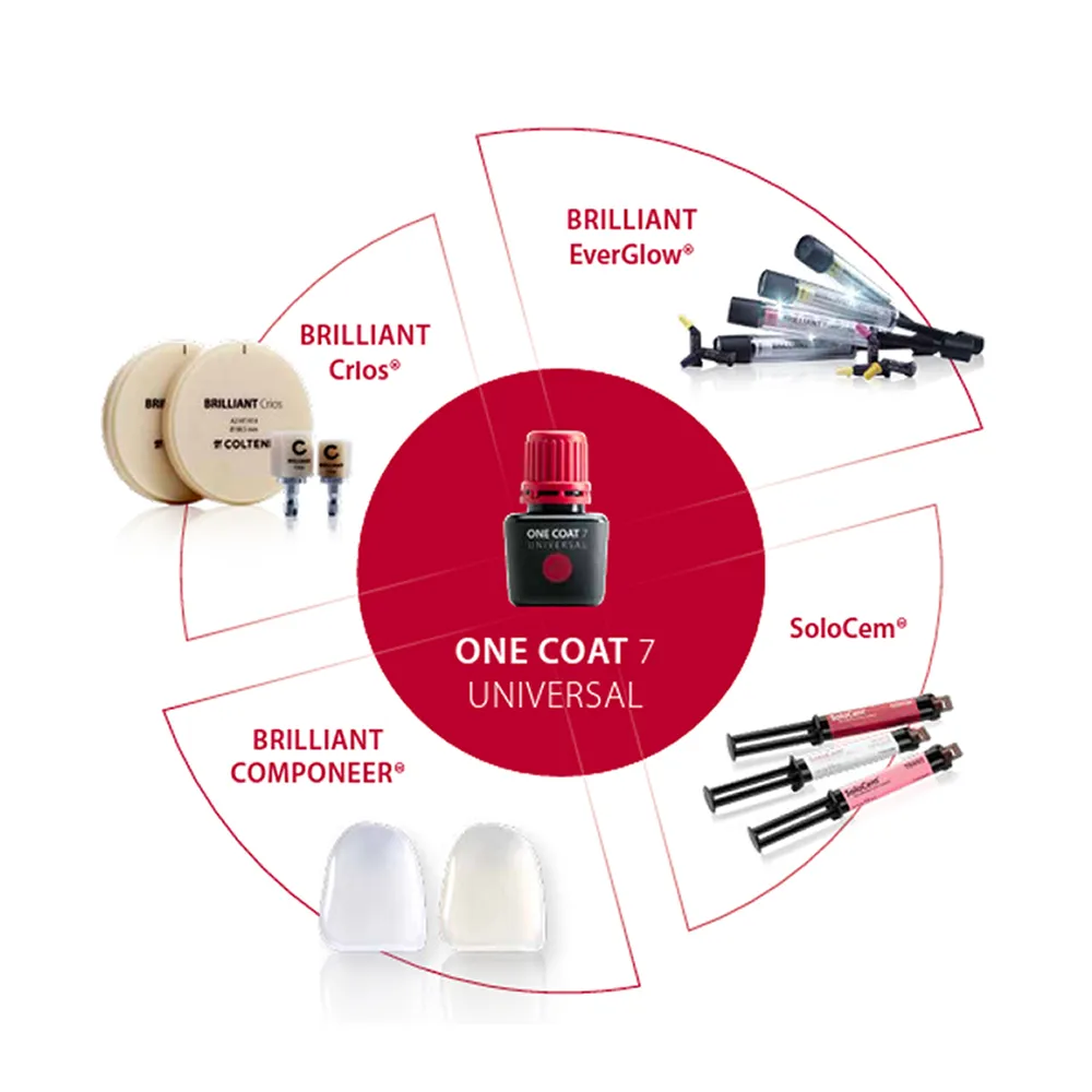 Coltene One Coat 7 Universal 5ml bond is a dental bonding agent designed to provide reliable and strong adhesive bonding in various restorative and prosthetic dental procedures. It is a one-step, self-etching, and light-cured bonding agent that simplifies the bonding process and enhances bond strength.This bonding agent features a unique formulation that allows for excellent adhesion to both enamel and dentin surfaces. It creates a strong bond with the tooth structure, providing stability and longevity to restorations. The bonding agent is compatible with a wide range of restorative materials, including composite resin, ceramic, and metal, making it versatile for different treatment applications.Coltene One Coat 7 Universal bond is easy to use, as it combines etching, priming, and bonding steps into one application. It reduces the overall chairside time and improves workflow efficiency. The bond is available in a convenient 5ml bottle, ensuring an adequate supply for multiple procedures.