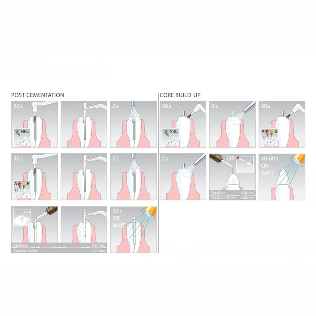 The ParaCore Slow Intro Kit is a versatile dental material designed for core build-up, cementing root posts, and indirect restorations. It is a composite-based, dual-cured, and radiopaque material that provides reliable and durable results. When used for core build-up, the ParaCore Slow Intro Kit helps in the reconstruction of severely damaged teeth. It offers excellent strength and adhesion properties, allowing for the creation of a solid foundation for the placement of a crown or bridge. The material’s composition includes methacrylates, fluoride, barium glass, and amorphous silica, which contribute to its mechanical and radiographic properties.