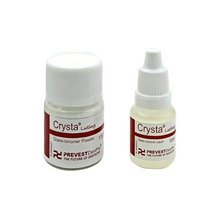 Crysta Luting is a convenient self curing , fine particle, fluoride releasing, glass ionomer luting cement for excellent tooth adhesion in crowns , bridges, securing inlays, onlays, post and orthodontic brackets. It is useful for a wide range of clinical applications. Crysta luting is available in a universal light yellow shade in Powder and Liquid Kits.