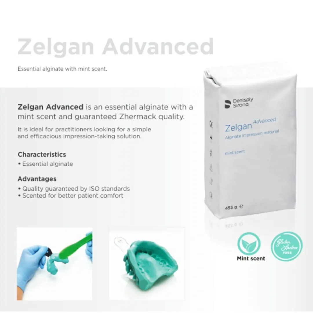 Dentsply Zelgan Advanced is a dust-free irreversible hydrocolloid alginate impression material that can be used to make perfect preliminary dental impressions with excellent reproducibility of the anatomical features of the dental arches. This quality impression material can be used to make dental impressions to fabricate study models, models of the opposing arch and working models for the fabrication of orthodontic appliances, removable prostheses, and temporary restorations. Special formulation of the powder eliminates dust during mixing. This aids the clinician to make dental impressions of higher quality. To enhance the adhesion of the impression of the tray, alginate tray adhesive materials may be used.