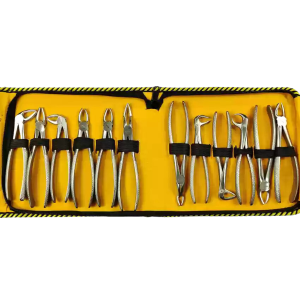A complete set of 12 pieces extraction forceps set, for both maxilla and mandibular teeth, comes with high-quality stainless-steel material, those are rust-free.
