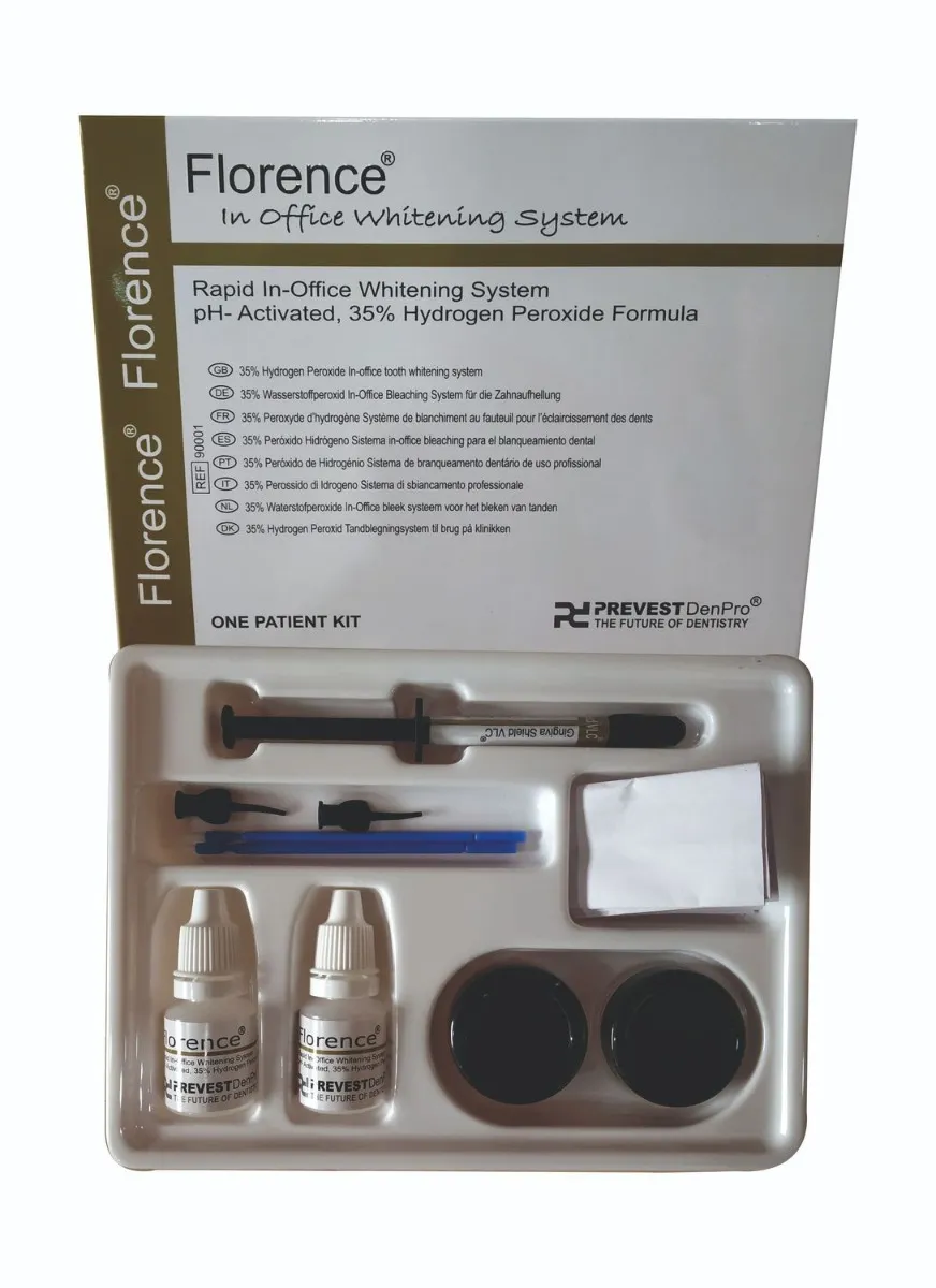 Florence In-office whitening System is a rapid and easiest way to effectively whiten the teeth In-Office. It is based on a pH-Activated, 35% Hydrogen Peroxide formula with a build-in desensitizer. It is a complete professional whitening system, safe and effective.