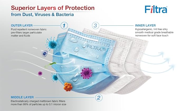 - Extra Thick & Soft Ear Bands: Filtra masks all now use an enhanced extra thick and soft 5 mm latext free elastic ear loops. With generous length and additional elongation, the ear loops do not apply pressure on the ears and allow the user to wear for extended periods without pain.