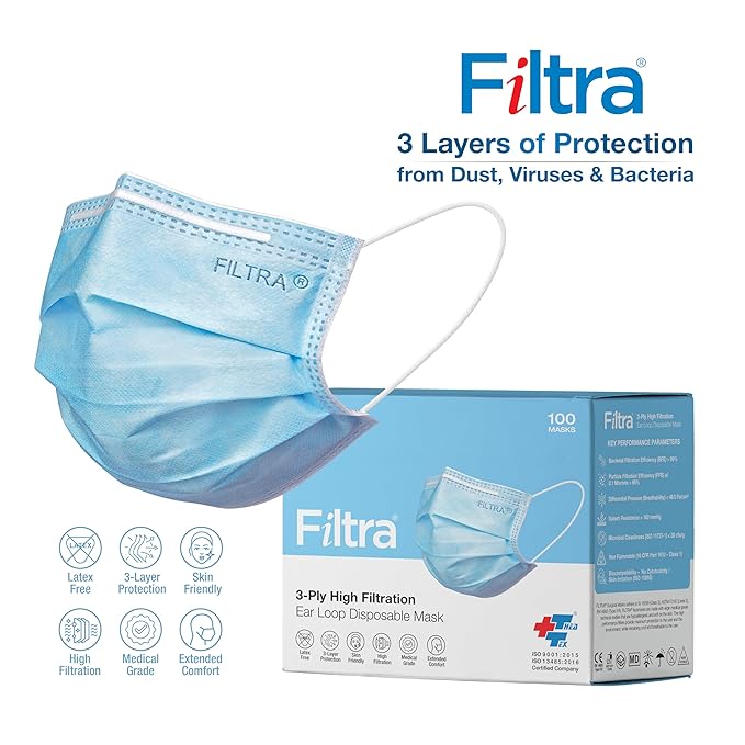- Fluid Repellency & Splash Resistant: By using three layers of 25 Gsm velvet smooth medical grade technical textiles, our masks which are tested for splash using synthetic blood. Even with a test force > 160 mmHg, the masks remain impenetrable to fluids and splash backs. So even if it’s blood splash or someone sneezing & coughing on you, Filtra masks will keep you safe and dry!