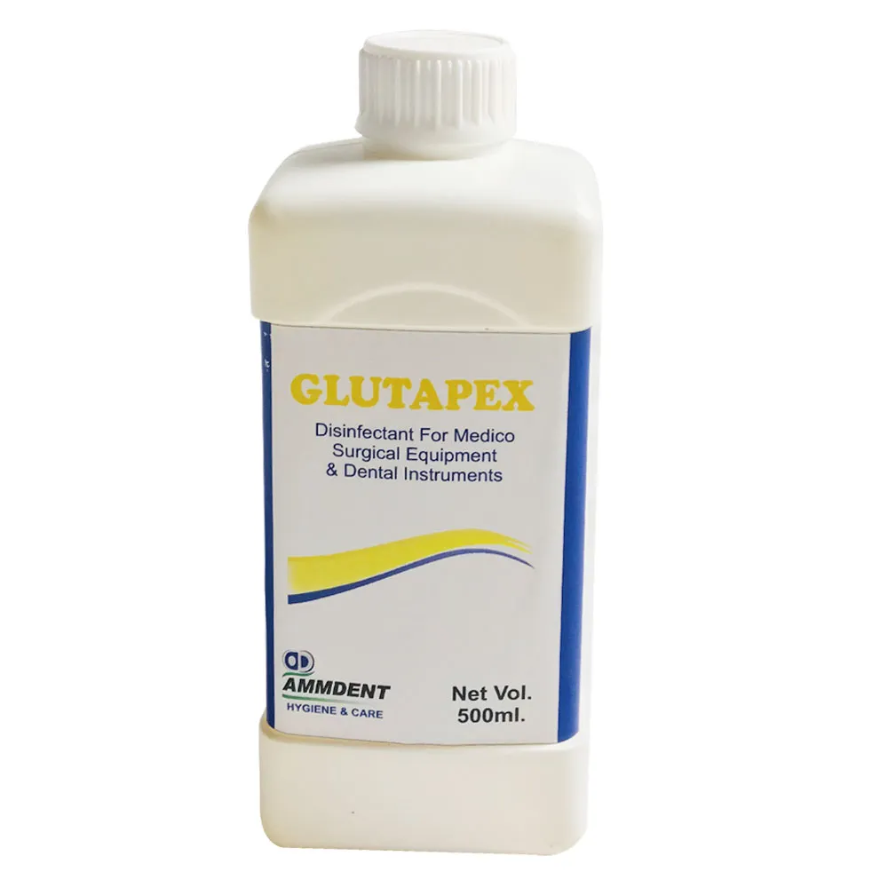 Ammdent Glutapex Cleaner 500ml offers high-level disinfection with a balanced composition of 8% w/v Formaldehyde and 7% w/v Glutaraldehyde. It is ideal for emergency disinfection across a variety of materials including metal, glass, steel, porcelain, plastic, ceramic, and rubber. The formulation includes surfactant cleaners for pre-cleaning and an anti-rust agent for material compatibility. Glutaraldehyde’s stability at a slightly acidic pH enhances its sporicidal efficacy while minimizing damage. It polymerizes slowly, killing dried spores within 2 minutes. With bactericidal, fungicidal, tuberculocidal, virucidal, and sporicidal activity, it ensures comprehensive microbicidal action. Safety precautions include wearing gloves, protecting eyes from splashes, and using it only in well-ventilated areas. The synergistic action of formaldehyde and glutaraldehyde makes it 10 times more lethal against pathogens. Ammdent Glutapex Cleaner 500ml is a reliable solution for effective disinfection needs.