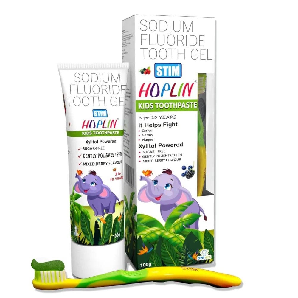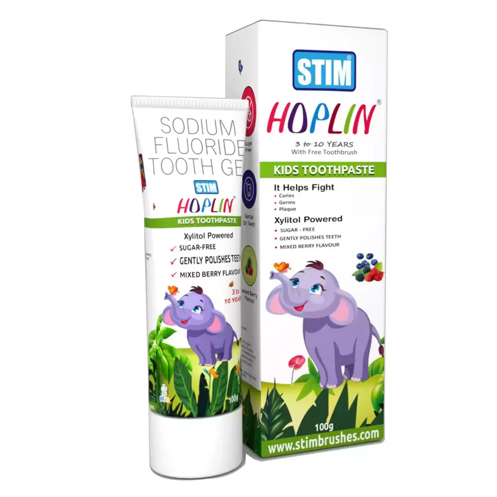Hoplin Kids toothpaste 3 – 10 years is developed for growing kids. Hoplin Kids is powered with fluoride which helps in strengthening enamel and xylitol for preventing vaities. It is available in Mixed Berry Flavours. It comes with a free toothbrush for the perfect cleaning of teeth. The toothbrush also has a tongue scrapper, to keep the tongue free from bacteria and plaque. Safe amount of Fluoride (550ppm) keeps the enamel strong. Xylitol powered for preventing cavities.
