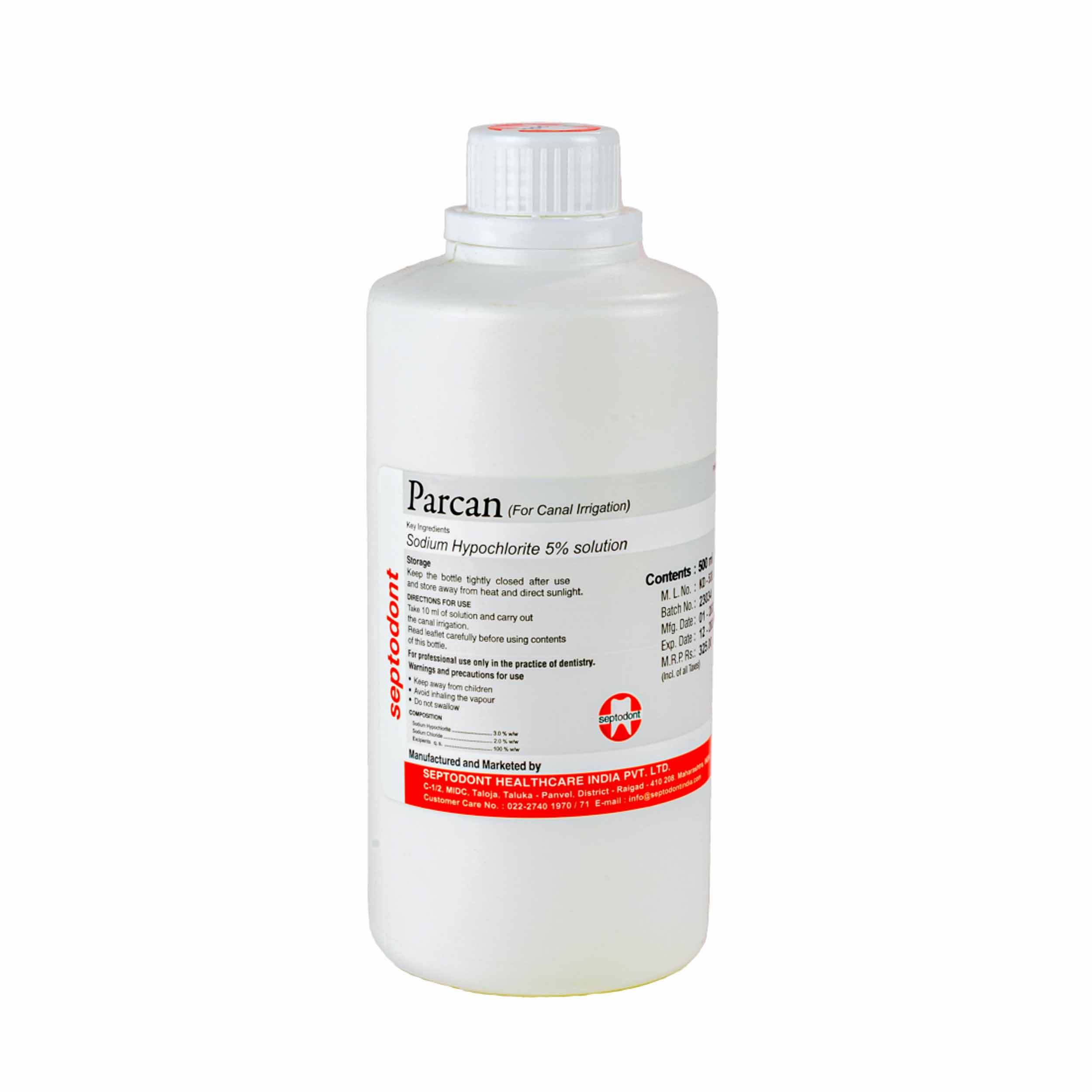 Septodont Parcan is a specialized irrigation solution developed specifically for root canal preparation in dentistry. It offers a stabilized and buffered 5% sodium hypochlorite formulation, meeting the requirements of an effective and efficient irrigation solution.Composed of a 39% stabilized solution of sodium hypochlorite, with additional components such as sodium chloride, sodium carbonate, and solute gs, Septodont Parcan demonstrates remarkable chemical effects by effectively dissolving the organic matrix of the dentin. This action facilitates easy canal flaring, an essential step in root canal preparation. Moreover, the sodium hypochlorite content of Parcan ensures potent bactericidal properties, effectively eliminating bacteria from the root canal.
