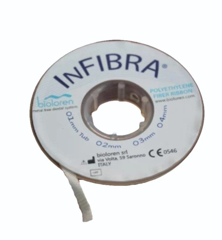 Ammdent Infibra Fiber Splint is made of long longitudinal white and high crystallized polyethylene fiber, Which gives high mechanical characteristics, ideal for dental use. The special interlacing enables a net cut and the complete padding with all flowable resin composites Unfilled and acrylic resin. Size : 1mm, 2mm, 3mm, 4mm.