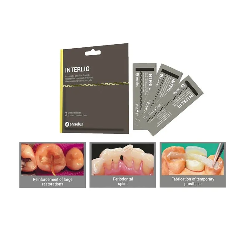 Interlig is a reinforced composite material with glass fibers, for use in the clinic, with a range of applications: temporary periodontal or orthodontic immobilization, for emergency treatment of teeth lost due to periodontitis, pre-surgical splinting, for the reinforcement structure of fi xed prosthesis, either mediate or immediate, for making intraradicular cores, for space retaining in primary or permanent dentition, for reinforcement of acrylic structure (provisional, total prostheses), for reinforcement of large restorations of composite resin.