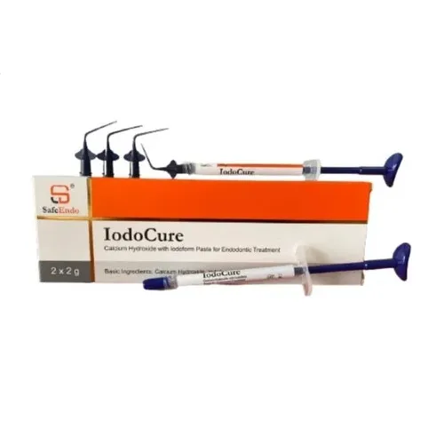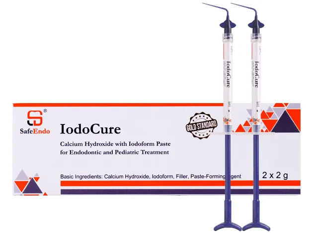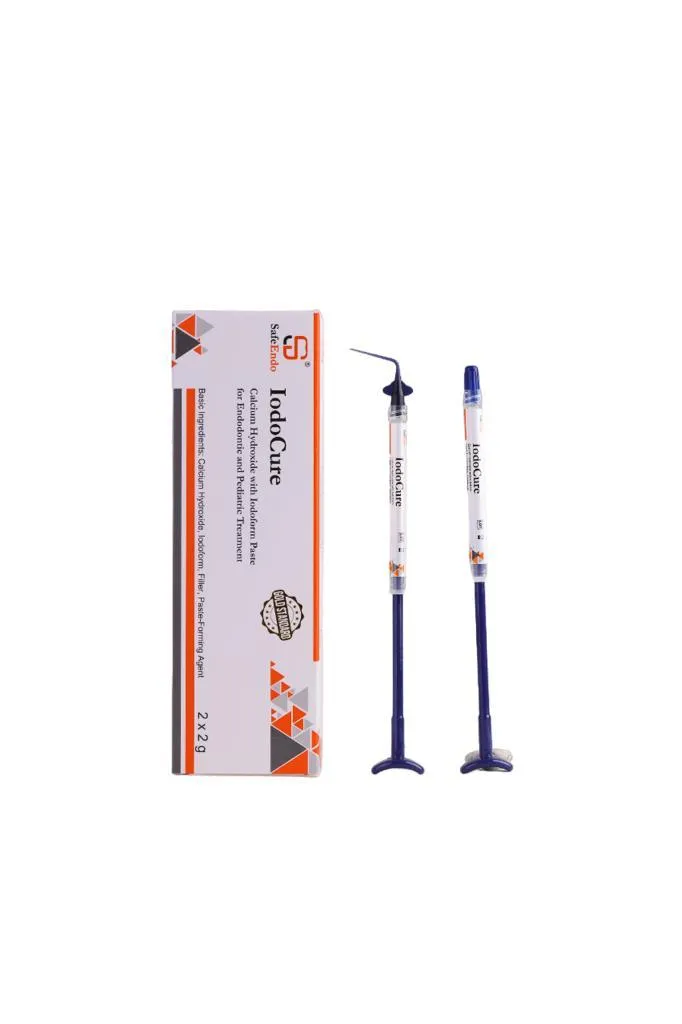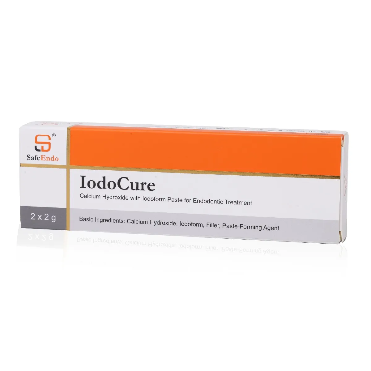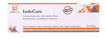 SafeEndo IodoCure calcium Hydroxide paste with iodoform (Radiopaque), used as temporary or permanent root filling material.