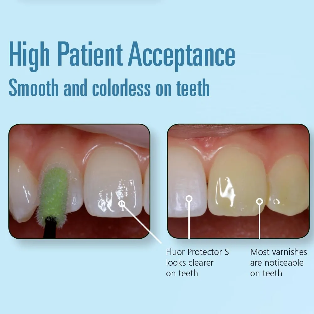 Ivoclar FluorProtector S Fluoride Protective Varnish, a solution for dentinal hypersensitivity, exposed cervicals, and post-whitening sensitivity. With its high fluoride uptake and fast application, it provides effective enamel protection and long-lasting relief. Unlike competitors, FluorProtector S boasts a lower initial fluoride concentration and thinner coating, ensuring safety and comfort for patients of all ages. Its innovative homogeneous fluoride source enables immediate availability and sustained protection, surpassing traditional varnishes. Upon application, FluorProtector S forms a protective calcium fluoride coating through saliva activation, fortifying enamel against acid attacks. Its thin, transparent layer leaves teeth clean and virtually undetectable, unlike sticky, yellowish varnishes. Experience the difference with FluorProtector S, delivering exceptional dental care and patient satisfaction.