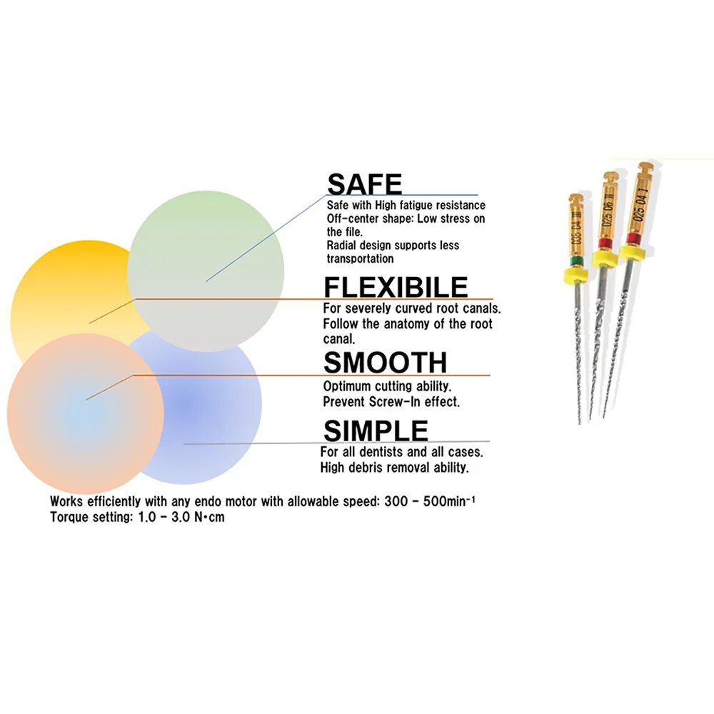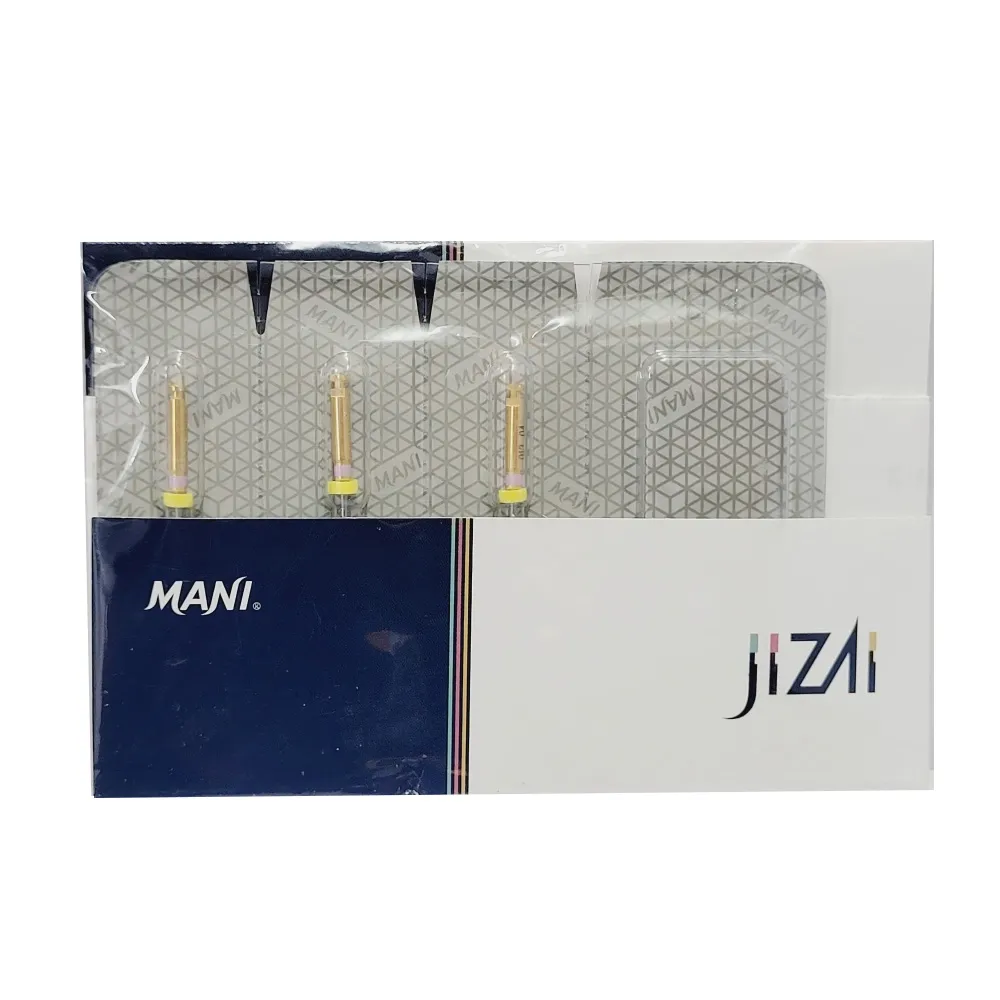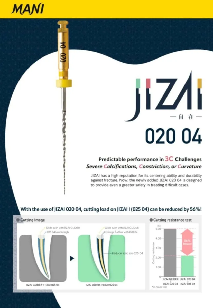 Description-The New Mani Jizai NiTi Rotary File exhibits great flexibility for shaping those severely curved canals with ease and an off-centered rhomboidal cross-section allows even & efficient scrapping of the entire canal wall.JIZAI allows to maintain canal anatomy thanks to its high center ability, features Control Memory & heat treatment that provides greater flexibility with excellent resistance towards micro cracks. Following the anatomy of the root canal-Due to unique heat treatment technology and its cross-section, JIZAI has a significantly low risk of the ledge, transportation, and perforation. Simple sequence with only 3 files- Tip size and taper are written on the shank.