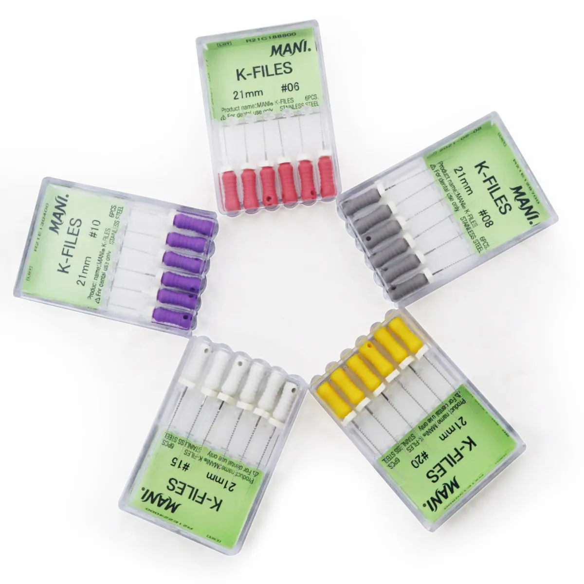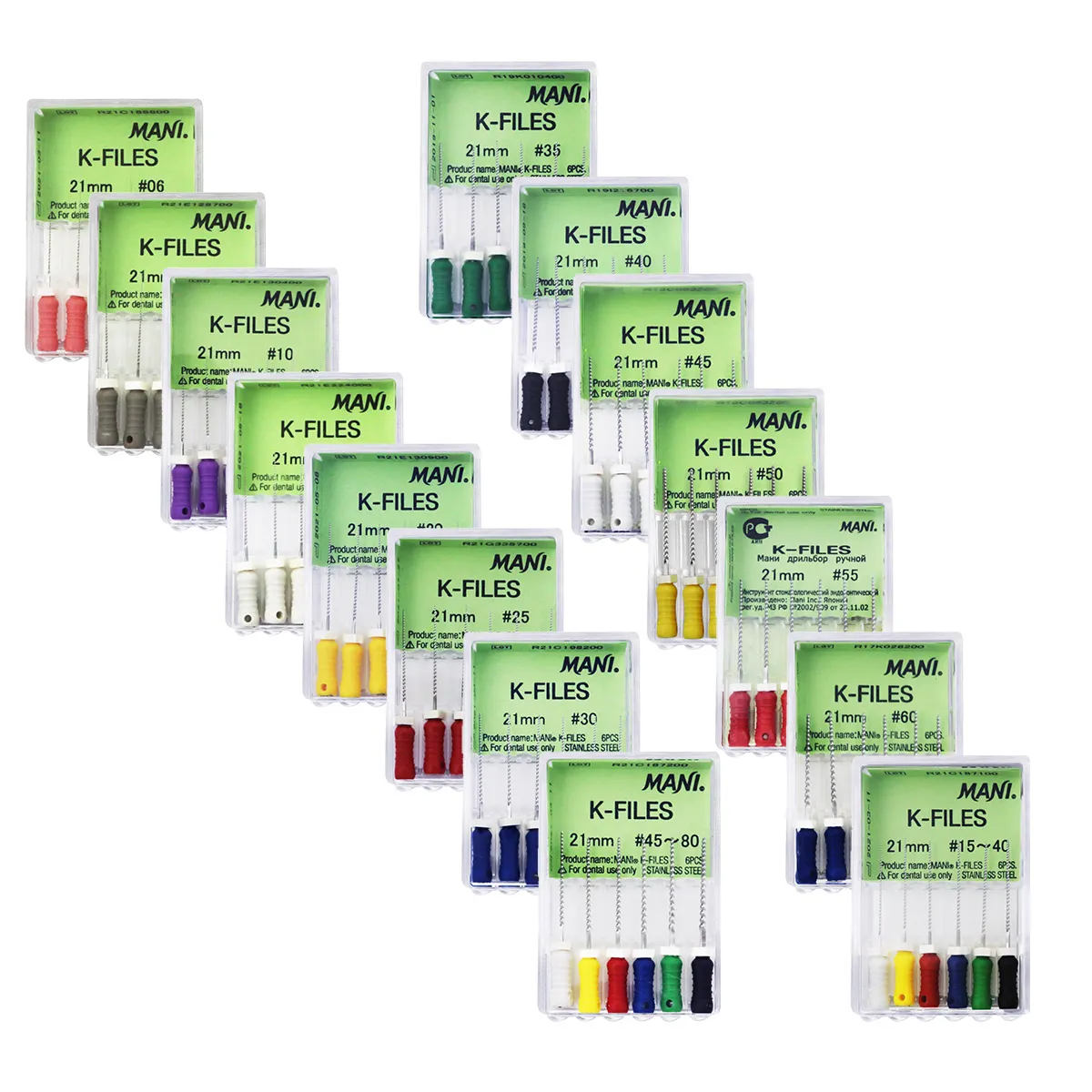 Mani K-Files 21mm are precision dental instruments designed to excel in endodontic procedures, with a particular focus on root canal treatments. Manufactured by the reputable brand Mani, these files feature a specific length of 21 millimeters, making them essential tools for dental professionals. The primary function of Mani K-Files 21mm is to facilitate the thorough cleaning and shaping of root canals. Their slender yet robust design allows dentists to access the entire length of the root canal, ensuring effective removal of debris and meticulous shaping. They are available in various sizes and tapers to cater to diverse tooth anatomies and clinical requirements, providing dentists with versatility and precision. The quality of Mani K-Files is underscored by their construction from high-quality materials, ensuring longevity and consistent performance during dental procedures. Their precision in cleaning and shaping root canals enhances the efficiency of root canal treatments. Furthermore, the files are thoughtfully designed with smooth edges, prioritizing patient comfort during the procedure. Dentists can navigate the intricate root canal system with confidence, ensuring that patients experience minimal discomfort. Mani K-Files 21mm are invaluable instruments in the hands of dentists, empowering them to achieve precise and efficient root canal treatments while prioritizing the well-being and comfort of their patients. Their quality, precision, and versatility make them a staple in the field of endodontics.