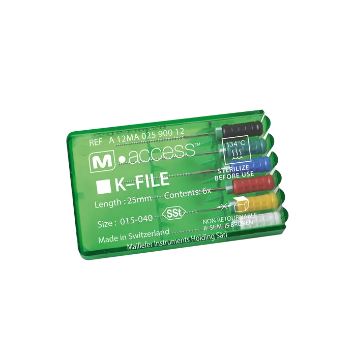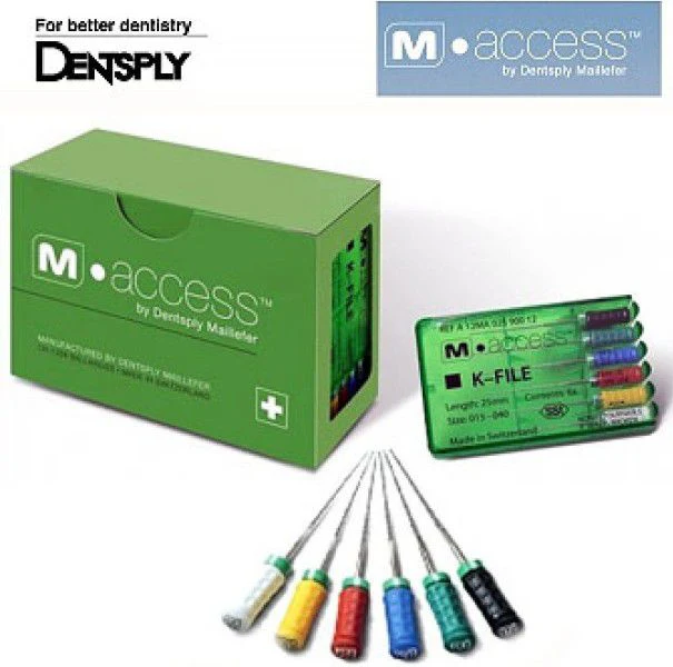 Dentsply M Access K Files are stainless steel dental k files used in endodontics. The cross sections of the dentsply k files are square from sizes 6 Â – 40 and triangular from size 45 onwards. The recommended motion of action for the k files is clockwise with rotation and half turn twists. The comprehensive and affordable range of hand file offered by Dentsply is designed to offer dentists simplicity and efficiency in root canal treatment. The k files by Dentsply have an ergonomic handle and safety grooves that improve functionality.