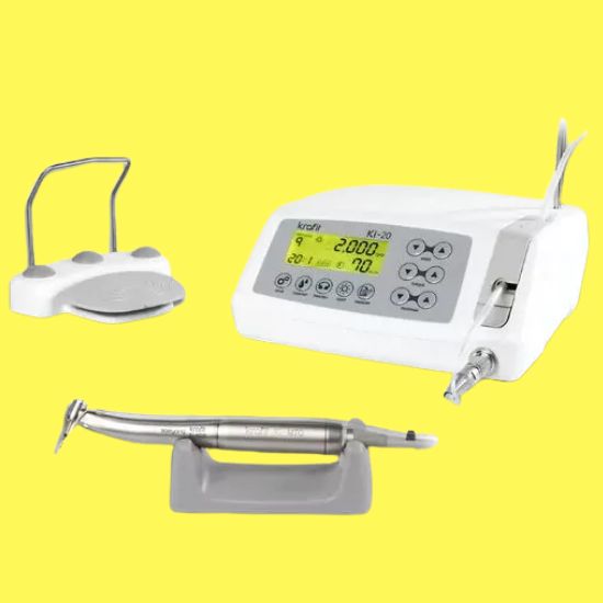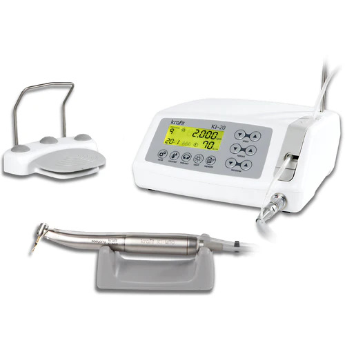 Surgical Micromotor for Implantology with Physiodispenser High perfrmance combined with extreme simplicity and comes with a new-concept pedal that represents an absolute novelty. Technoimplant is entirely designed and buit by RTC sistemi, both for hardware and software. Technoimplant is the result of 10 years’ experience in the design and development of electro-medical apparatus for implantology and endodontics, based on well-tested and proven technology. Innovative hardware and software to obviate the kinetic energy of the rolating elements-motor and contrangle – which is discharged onto the bur. The torque control will thus be more precise at any speed. Features: Suitable for Oral and Maxillofacial Surgery Brushless Motor 9 Memory Programs: Optic (on/off), Speed, Gear ratio, Coolant, Forward/Reverse, Torque Speed: 30 – 2,000 RPM (20:1) Torque: from 5 to 70 Ncm (20:1) Optic LED Push Button Type Handpiece Light weight premium BLDC motor, low noise and low vibration Very Small Portable Footprint (W 9.44′′, D 8.85′′, H 3.82′′) Multi-functional foot control (Ki-F20) Key specification 70 Ncm torque (20:1) LCD Display Premium BLDC motor Technical Specification SUPPLY VOLTAGE AC230/115V = 50/60Hz NOISE <65dBA POWER 80VA TEMPERATURE OF USE From +15°C TO +40°C STORAGE TEMPERATURE From +5° Cto +70°c WEIGHT 2.6kg DIMENSION 255x255x110mm Packaging 1 Central Unit 1 Pedal 1 Micromotor 1 Plastic Holder 1 Metal Bar 1 Irrigation Tube Non-optic 1 Contra Angle Handpiece (20:1) or Optic Contra Angle Handpiece