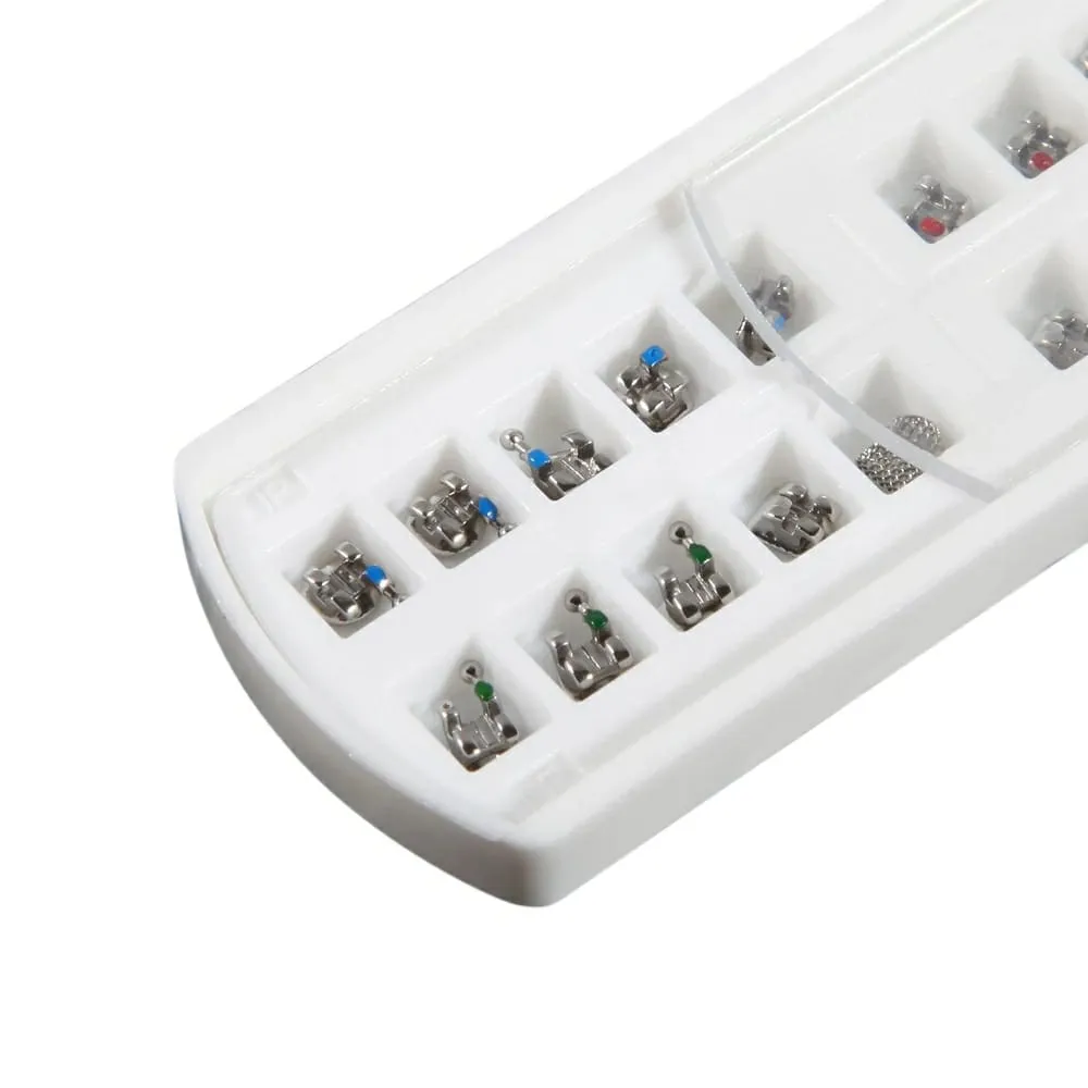 The bracket features corrosion-resistant passivated quality, ensuring long-term durability and maintaining stringent hygiene standards. The incorporation of color codings facilitates seamless identification, streamlining workflow efficiency. Additionally, the anatomically contoured base, characteristic of mini brackets, aligns with tooth contours, enhancing bonding strength.