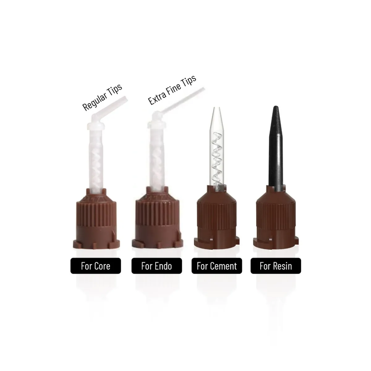 • Mixing Tips HP Brown/White 1:1 For Core With Regular Tips: These tips are ideal for mixing core materials in restorative dentistry, including materials like glass ionomer or composite resins used for core build-ups.