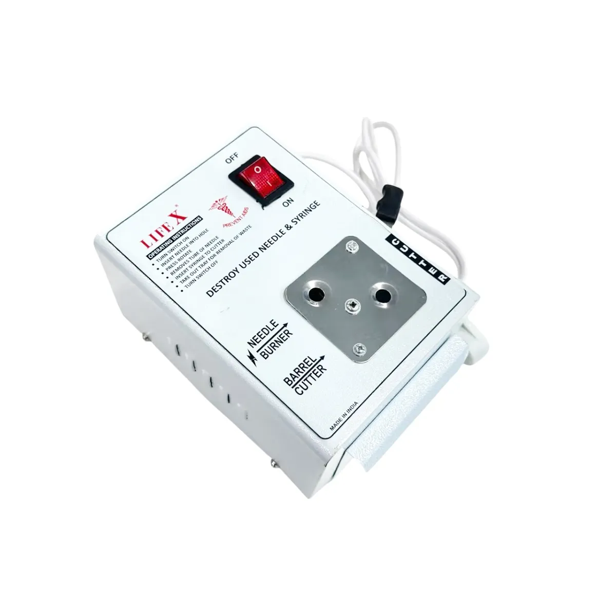 The equipment has a single step operation with push to open receptacle. The heavy duty transformer incinerates the needle instantaneously as it is inserted in the slot and syringe nozzle is terminated by pulling the blade handle manually.