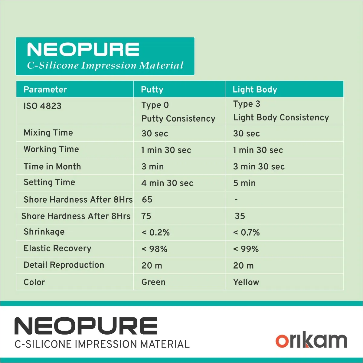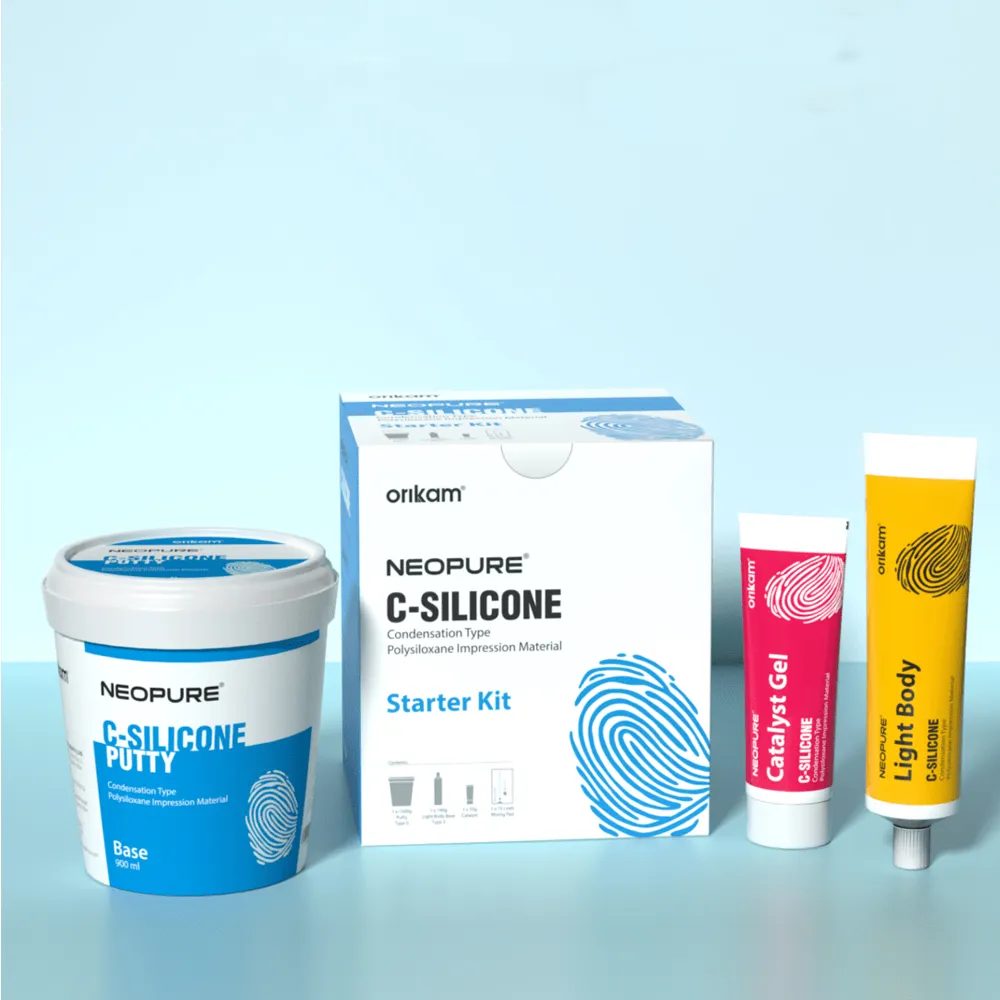 Neopure C-Silicone is a range of Rubber Based Condensation Impression Material. High viscosity condensation polysiloxane (base) is recommended for the two-phase technique (double step impression) in combination with Neopure C-Silicone Light Body.