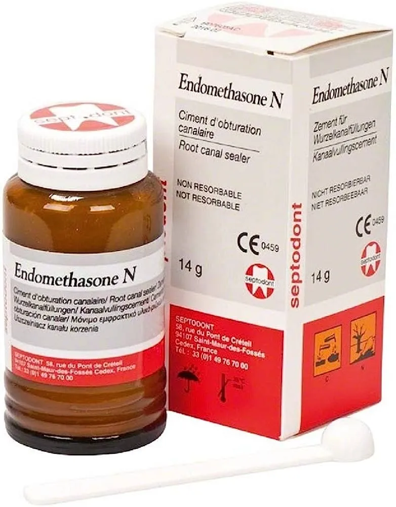 Septodont Endomethasone N is a dental material specifically designed for permanent root canal filling and sealing. It consists of a liquid and powder component that combine to form a reliable and effective paste. This paste possesses essential properties for successful root canal treatment. It offers excellent non-resorbable characteristics, ensuring stability and longevity of the filling. Its non-retractable nature maintains shape, providing a secure seal within the root canal to prevent bacterial entry and treatment failure. The material is radiopaque, and easily detectable on dental X-rays for accurate monitoring of the filled root canal. Additionally, Endomethasone N contains hydrocortisone acetate, providing anti-inflammatory activity to promote healing and enhance treatment success. To use Endomethasone N optimally, the treated tooth should be isolated, and the canal shaped, cleaned, rinsed, and dried. The paste is prepared by mixing the powder progressively into the liquid at a specific ratio. Various filling techniques can be employed, such as using a paste carrier or coating Gutta-Percha points for condensation techniques. Regular X-rays should be taken to ensure thorough filling. To maintain its quality, Endomethasone N should be stored below 25°C and protected from moisture.
